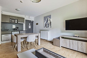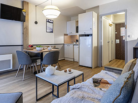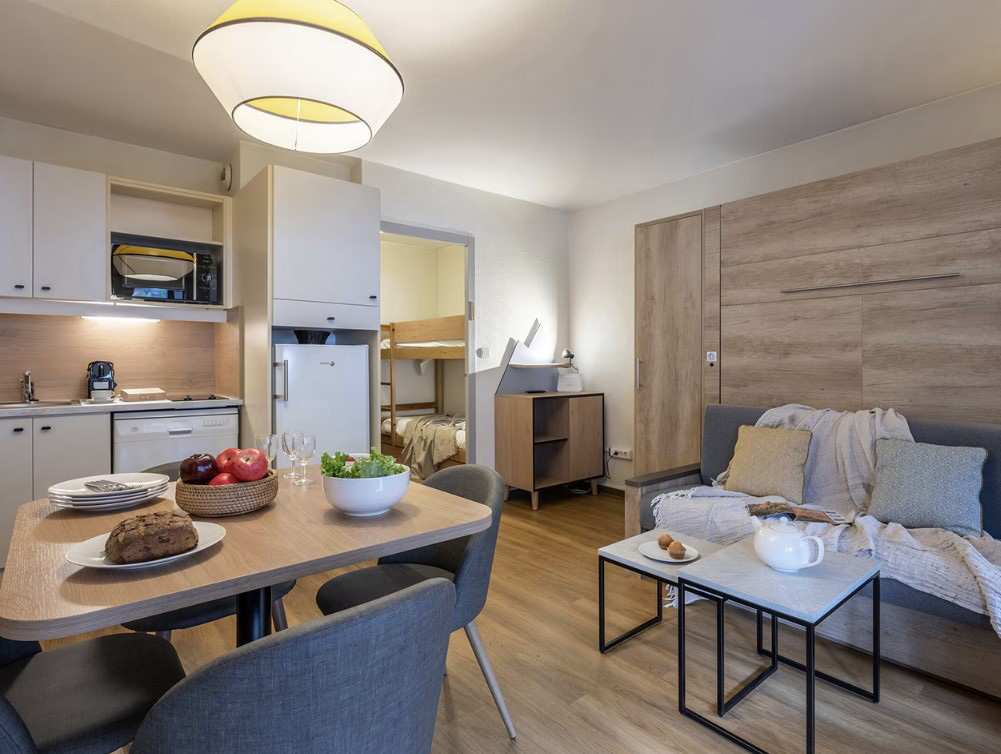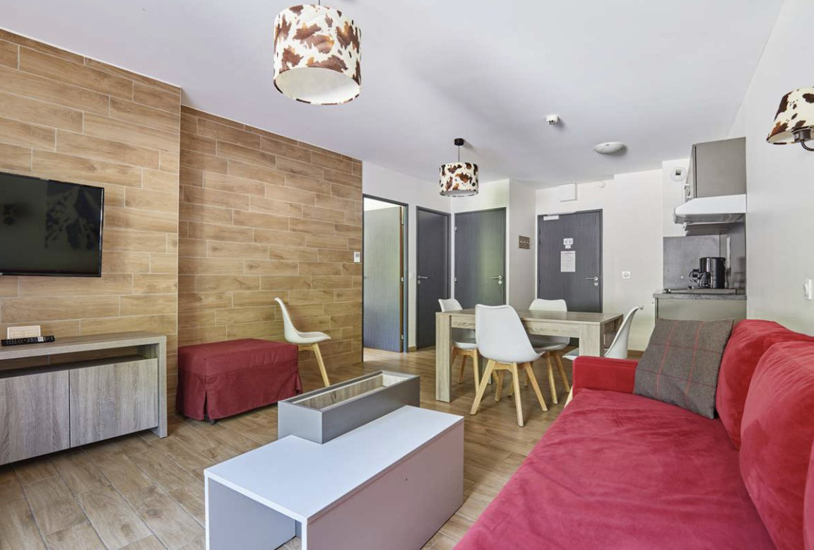 Apartamenty 2-pokojowe 3/4-osobowe: pokój z dwoma pojedynczymi łóżkami oddzielony od pokoju dziennego drzwiami lub zasłoną. Pokój dzienny z ławą – łóżkiem oraz drugim wysuwanym łóżkiem (czyli dwa pojedyncze łóżka) lub kanapa (łóżko podwójne). W pełni wyposażona i umeblowana kuchnia z 4 płytami vitroceramicznymi, wielofunkcyjnym piekarnikiem, okapem, lodówką, zmywarką, ekspresem do kawy, opiekaczem do chleba. Łazienka z wanną, kaloryferem do suszenia ręczników i WC. Telewizor, telefon, balkon.