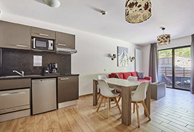 - Pokój dzienny z aneksem kuchennym rozkładaną kanapą sypialną (wysuwane łóżka pojedyncze) dla 2 osób