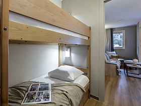 Apartament 2-pokojowy 6 osobowy z kabiną – pow. ok. 36m2. Pokój dzienny z rozkładaną kanapą dla dwóch osób. Pokój z podwójnym łóżkiem. Kabina z łóżkiem piętrowym. Dodatkowa łazienka z prysznicem i wc. Ekspozycja północna.